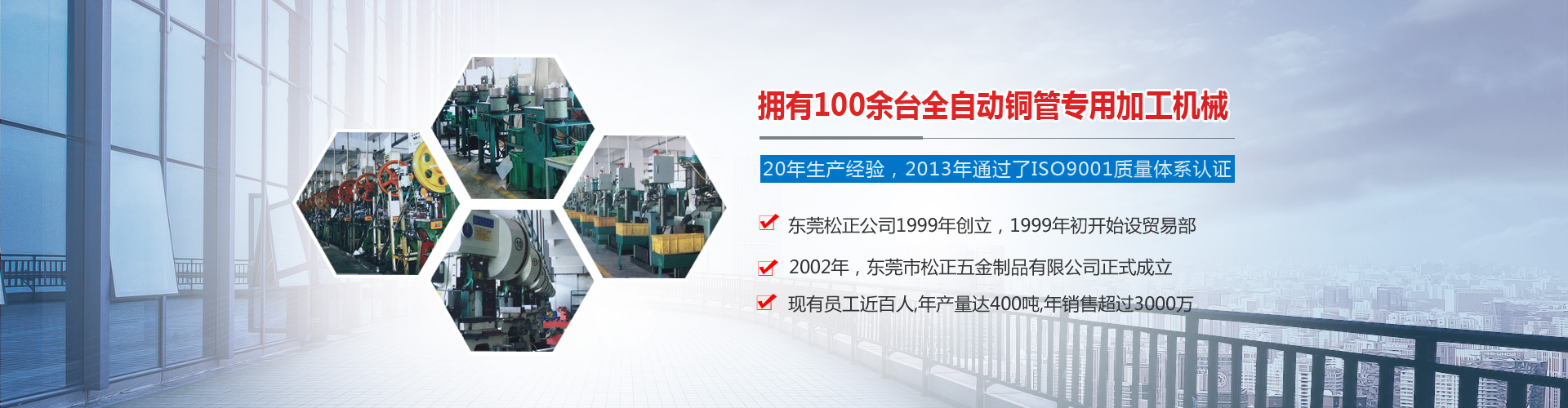 東莞松正公司1999年創(chuàng)立,1999年初開(kāi)始設(shè)貿(mào)易部,至2002年,東莞市松正五金制品有限公司正式成立。我公司專(zhuān)業(yè)從事銅管/鋁管/ 不銹鋼管、制造、研發(fā),累積了近20年的先進(jìn)生產(chǎn)經(jīng)驗(yàn),已于2013年6月通過(guò)了ISO9001質(zhì)量體系認(rèn)證。 公司現(xiàn)共有員工近百人,年產(chǎn)量達(dá)到400噸,年銷(xiāo)售超過(guò)3000萬(wàn).公司共設(shè)有7個(gè)職能部門(mén),分門(mén)別類(lèi)處理各項(xiàng)日常事務(wù),為方便溝通,還特設(shè)有總經(jīng)理信箱,員工有任何建議和意見(jiàn)均可由此向總經(jīng)理反應(yīng).     在硬件設(shè)施方面,公司現(xiàn)擁有全自動(dòng)銅管專(zhuān)用加工機(jī)械近壹百多臺(tái)和專(zhuān)業(yè)的檢測(cè)備,具有較強(qiáng)的生產(chǎn)和檢測(cè)能力。舉凡外徑在0.30mm~.....